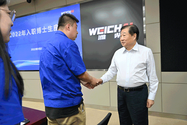 At 9:00 a.m. on September 21, 2022, Tan Xuguang presided over a symposium for Weichai's new doctoral graduate employees. Tan Xuguang shook hands with more than 30 new employees at the scene one by one and learned in detail about their work and life in Weichai.