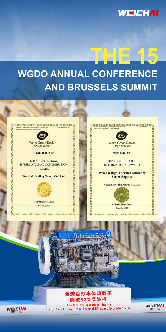 Recently, the 15th Annual Conference and Brussels Summit of the World Green Design Organization (WGDO) was held in Brussels, Belgium. Weichai's high thermal efficiency engine series won the "Green Design International Award". Weichai Group was honored with the "Green Design International Contribution Award", becoming the first company in the global industry to receive this distinction. Concurrently, five Weichai engineers were awarded the "Green Design Engineer (Senior)" certification by the WGDO.